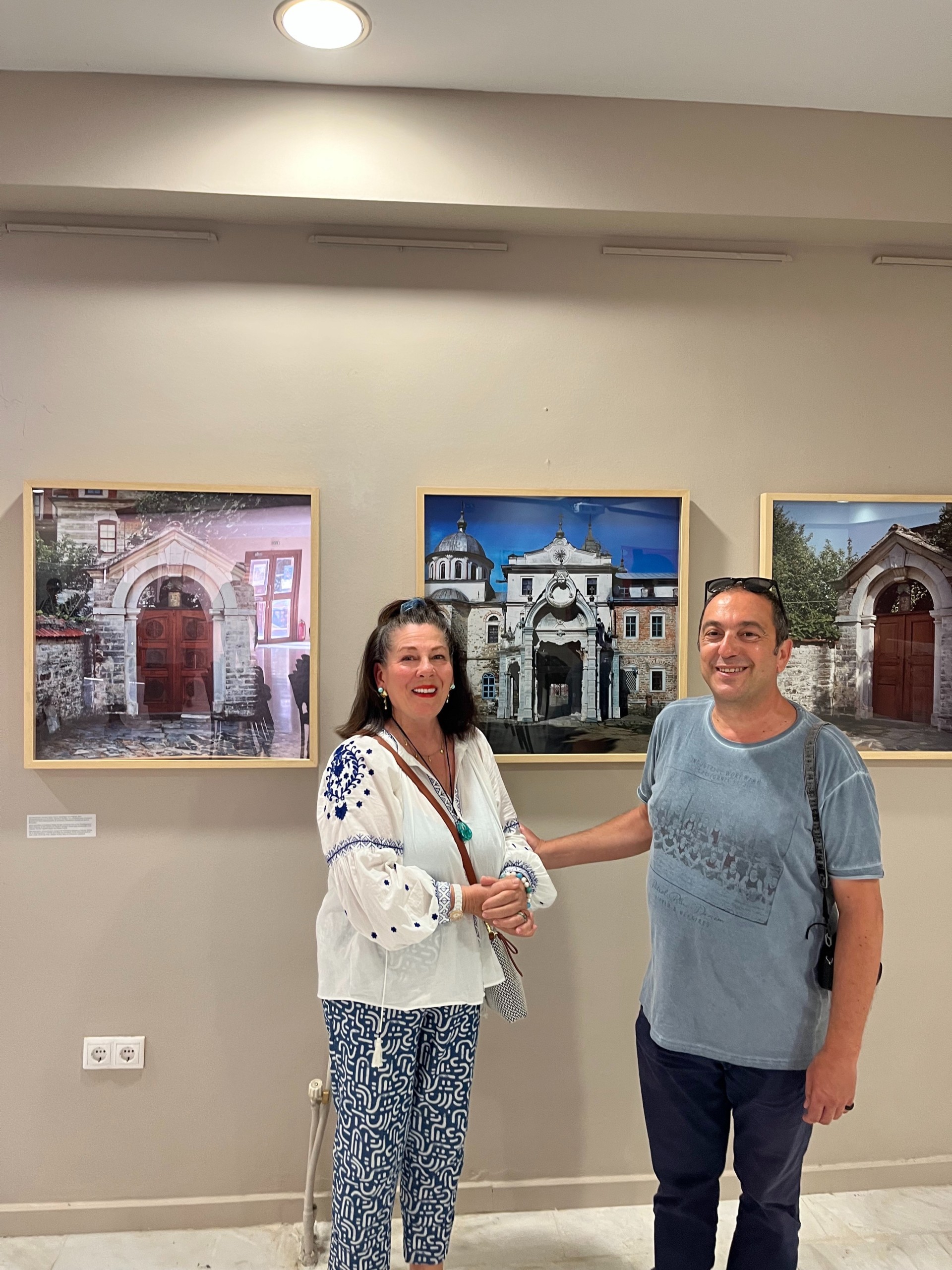 Την ατομική έκθεση φωτογραφίας του καλλιτέχνη φωτογράφου Δημήτρη Λουζικιώτη είχα την ευκαιρία να επισκεφτώ την ημέρα των εγκαινίων της. Ένας πολύ όμορφος και διάπλατος εκθεσιακός χώρος αγκαλιάζει με αρμονία τις όμορφες φωτογραφίες παραθύρων και θυρών από τα Ιερά Μοναστήρια του Αγίου Όρους. Την ματιά αιχμαλωτίζουν οι λεπτομέρειες της καλλιτεχνικής τους φυσιογνωμίας με τα λαμπερά και άλλοτε σκοτεινά χρώματα. Ξεχωρίζουν το μπλε του ουρανού και της θάλασσας όπως και το κόκκινο και αποχρώσεις του κίτρινου και καφέ της μάνας γης. Κομψοτεχνήματα κατασκευής με άριστο αρχιτεκτονικό σχεδιασμό που σε κάθε μία πόρτα η παράθυρο διαφέρει. Λιτές όμορφες οι γραμμές οριοθετούν την πρόσοψη των Μοναστηριών με εκλεπτυσμό και σεβασμό στον χώρο και τόπο. Αυτή η έκθεση μας ταξιδεύει νοερά σε έναν κόσμο της Αγιότητας και του Μοναχισμού που σίγουρα πολλοί και όλες οι γυναίκες δεν έχουν την δυνατότητα να προσεγγίσουν. Πέτρες πελεκημένες, εναγκαλίζουν τα μακρόστενα παράθυρα και τις θύρες.