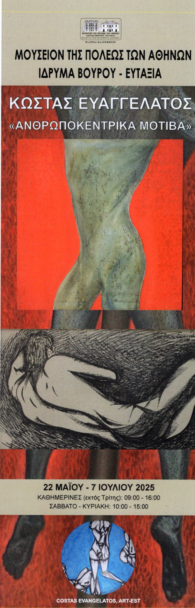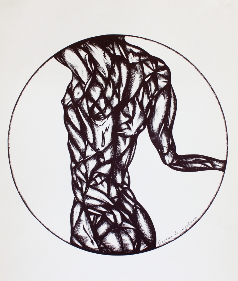 Οι δημιουργίες του ζωγράφου, performer, θεωρητικού της τέχνης και λογοτέχνη Κώστα Ευαγγελάτου πάντα δημιουργούν εντυπώσεις που συγκινούν και δίνουν δυνατότητα συνομιλίας με τους θεατές. Για μία ακόμη φορά στον ιστορικό και ιδιαίτερης ομορφιάς εκθεσιακό χώρο του Μουσείου της Πόλεως των Αθηνών έλαμψαν και εντυπωσίασαν τα υπέροχα ανδρικά σώματα σε μεγάλο μέγεθος. Εκπληκτικής σχεδιαστικής αφαίρεσης σώματα έδωσαν τον παλμό της τέχνης του Ευαγγελάτου σε έναν δικό του ρυθμό.